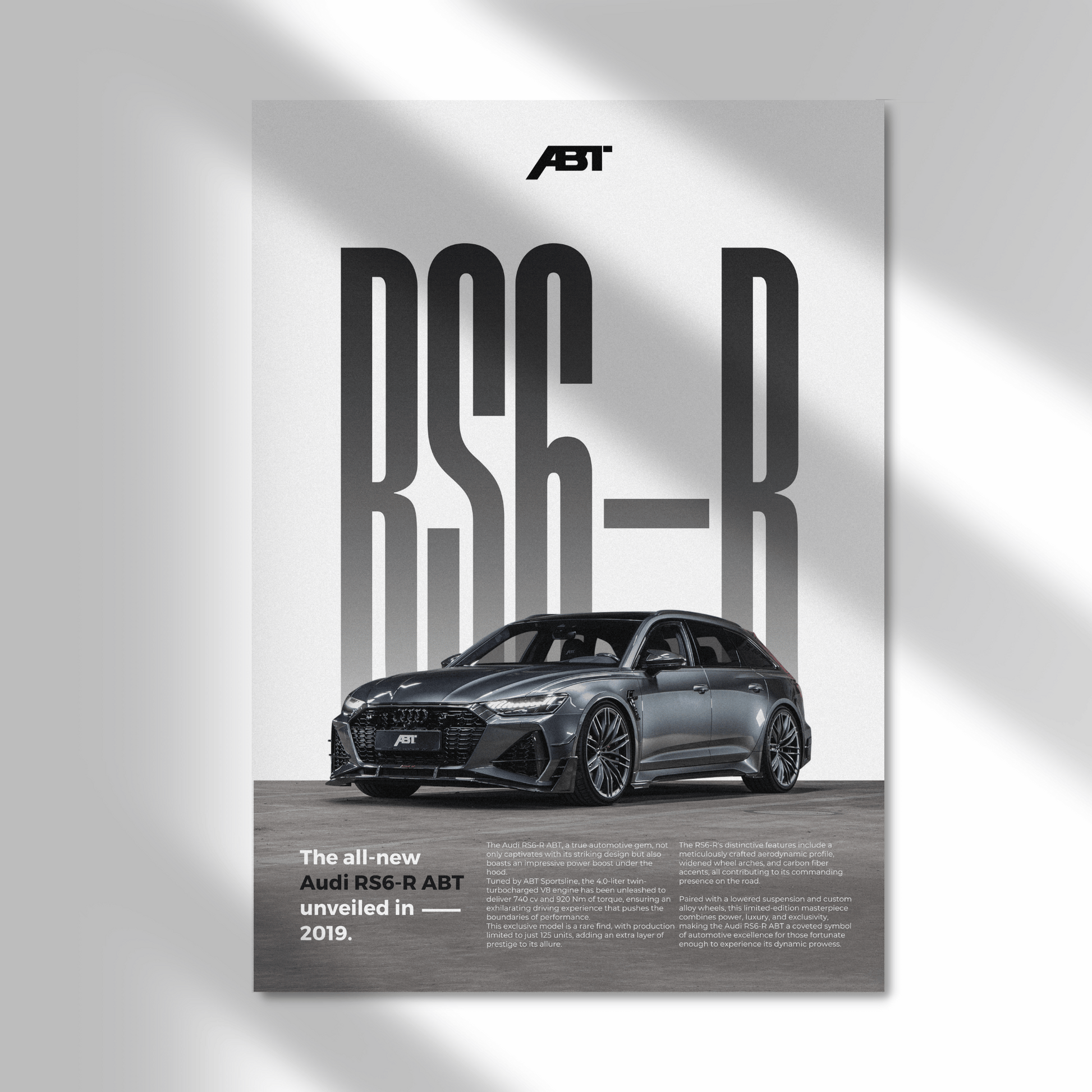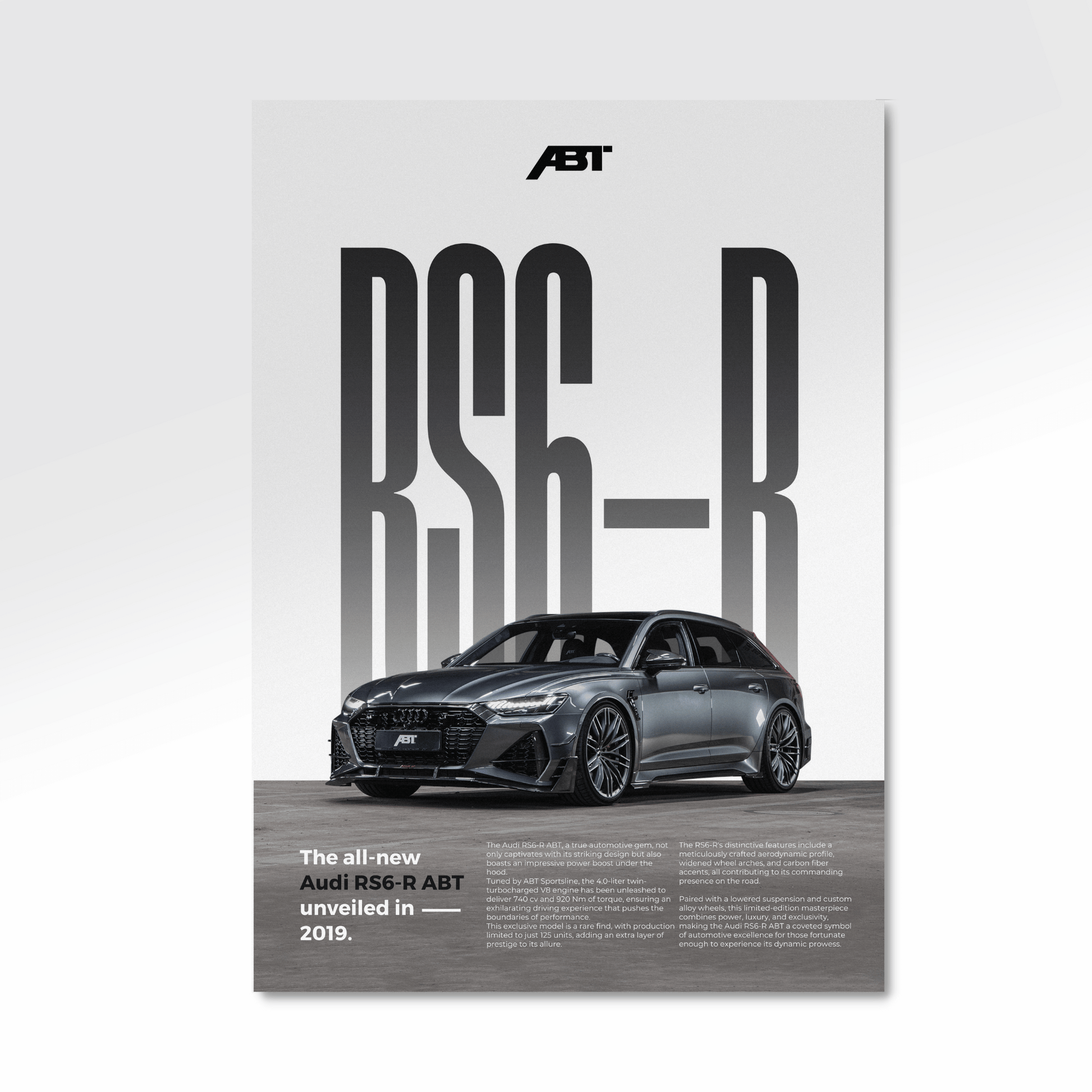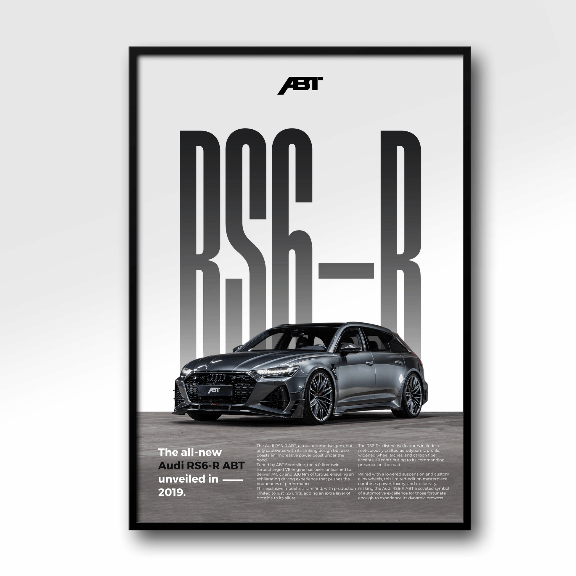 Affichez votre passion pour l'automobile avec ce magnifique poster de Audi RS6-R ABT en édition Classique.