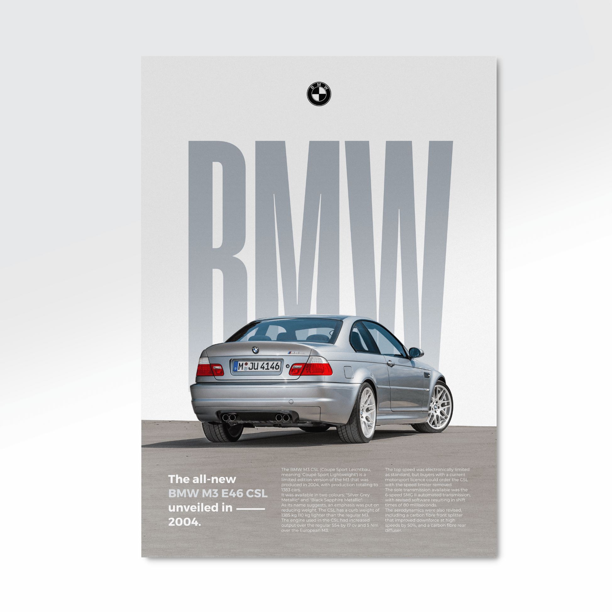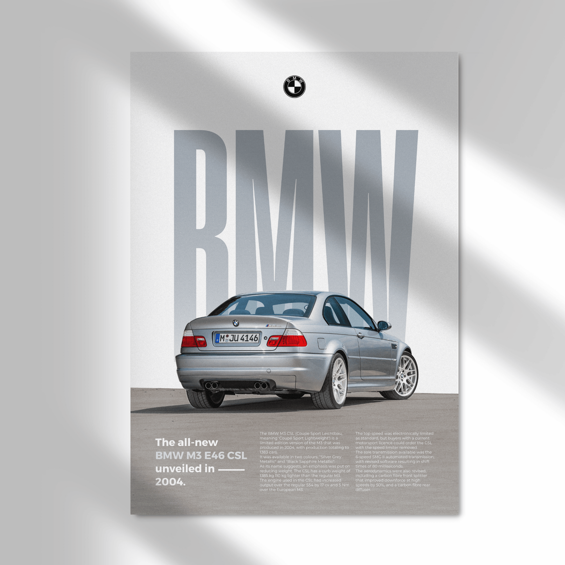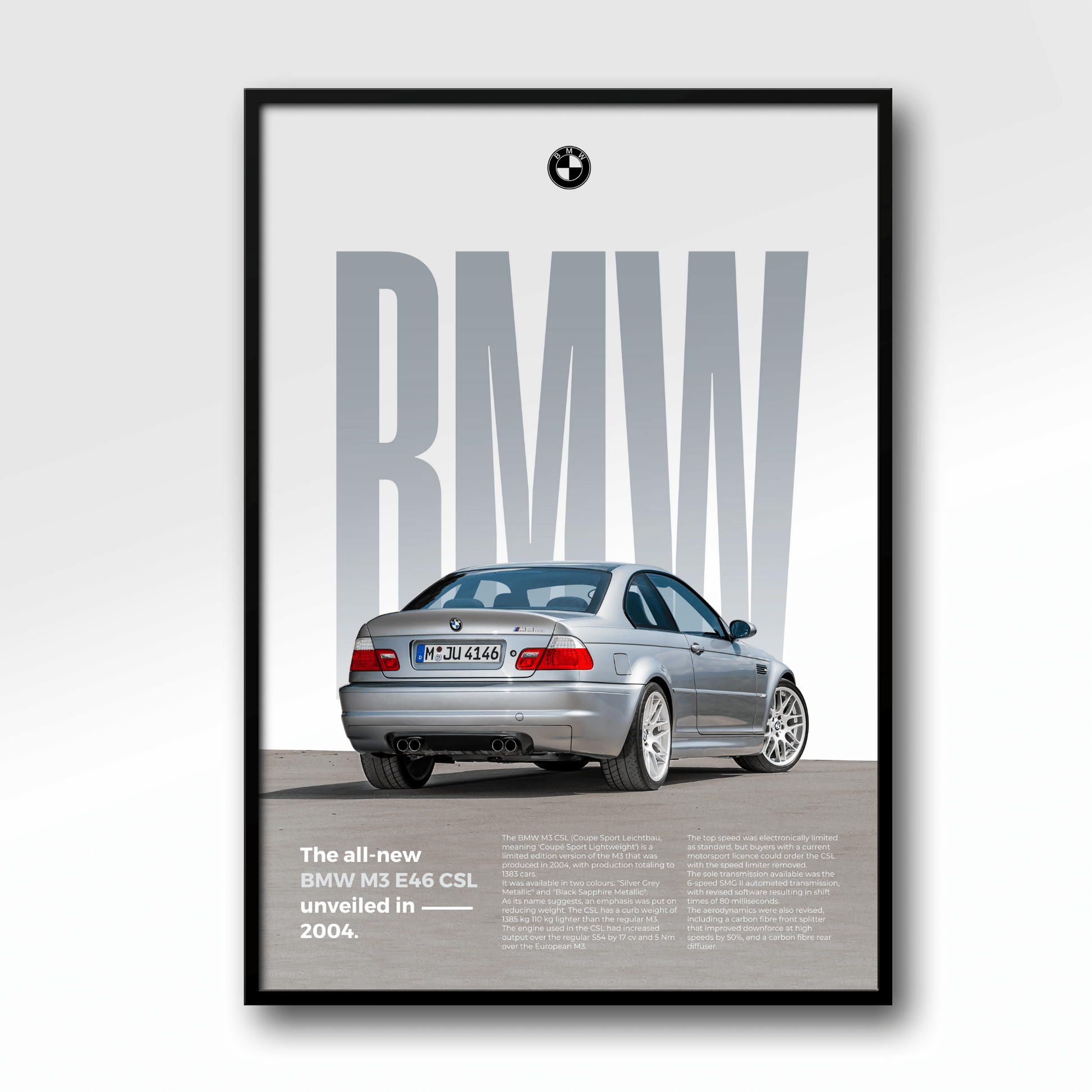 Affichez votre passion pour l'automobile avec ce magnifique poster de BMW M3 E46 CSL en édition Classique.