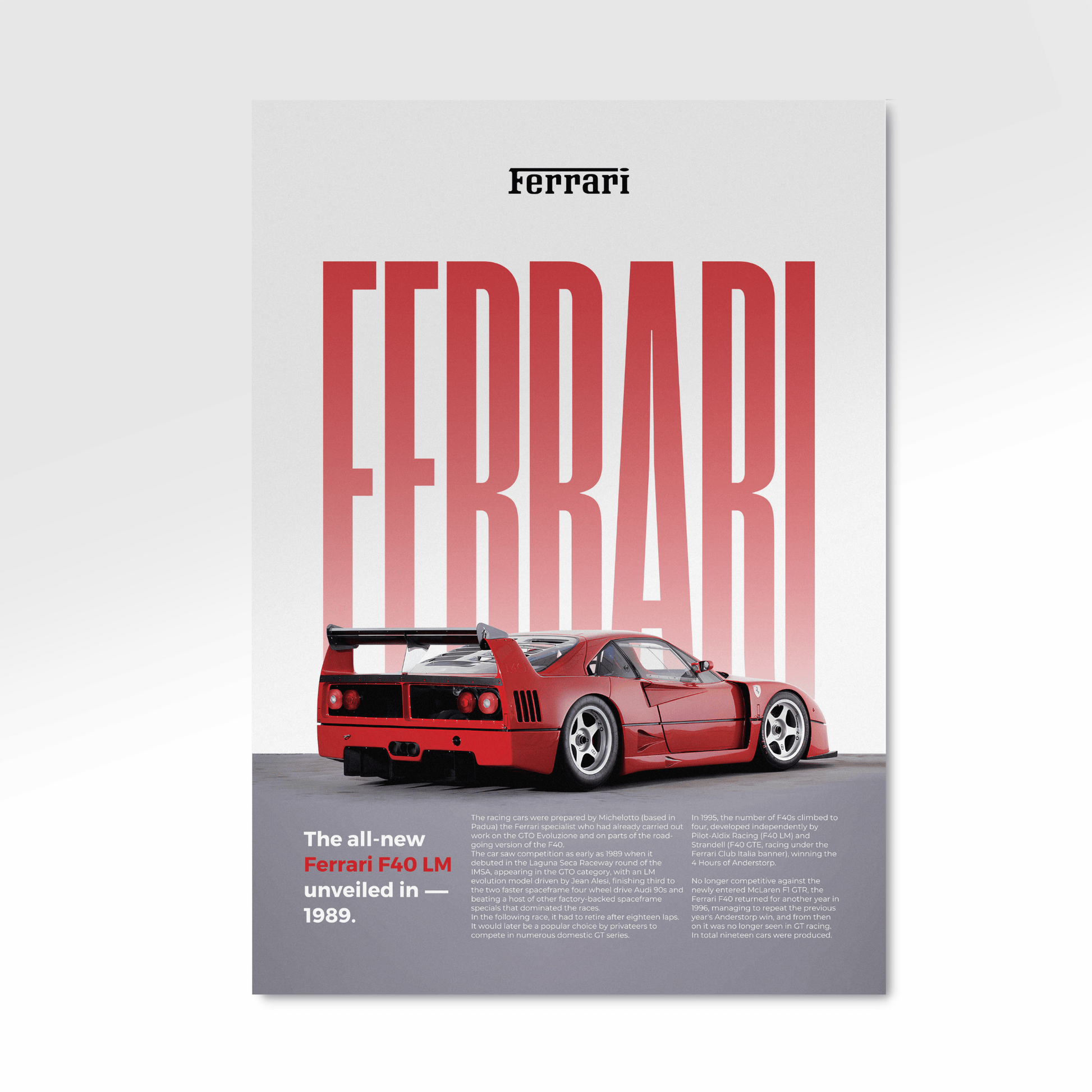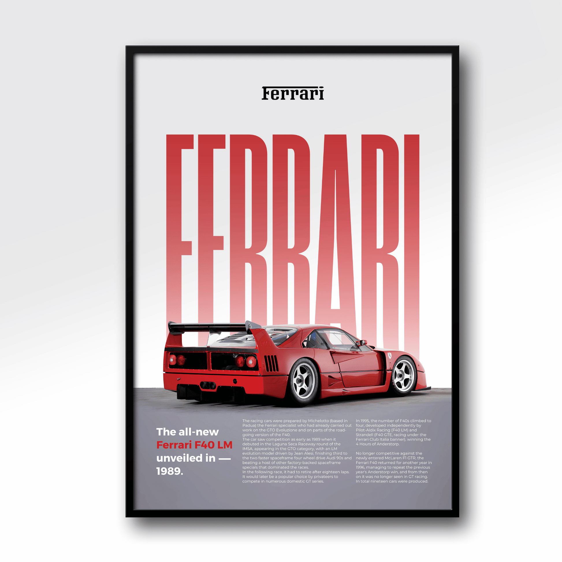Affichez votre passion pour l'automobile avec ce magnifique poster de Ferrari F40 LM en édition Classique.